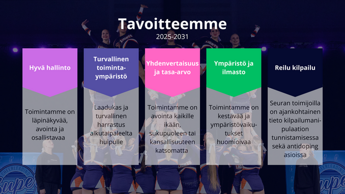 Vastuullisuus on kaikkien asia! Olemme sitoutuneet Suomen Olympiakomitean urheiluyhteisön vastuullisuusohjelmaan. Vastuullisuusohjelmassamme tarkastellaan avoimesti seuran nykytilannetta osa-alueittain, jonka perusteella on luotu tavoitteet tulevaisuuteen, sekä edistyksen mittarit. Osa-alueet ovat: hyvä hallinto, turvallinen toimintaympäristö, yhdenvertaisuus ja tasa-arvo, ympäristö ja ilmasto sekä reilu kilpailu. Ohjenuorana oman ohjelmamme tuottamisessa olemme käyttäneet Suomen cheerleadingliiton vastuullisuusohjelmaa, kuitenkin sovellettuna omaan toimintaympäristöömme, arvoihimme sekä strategiaamme.